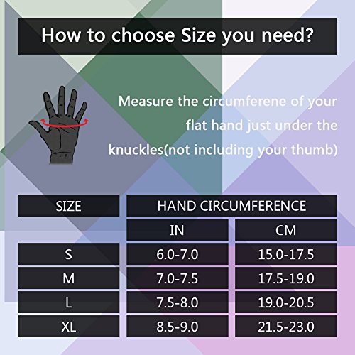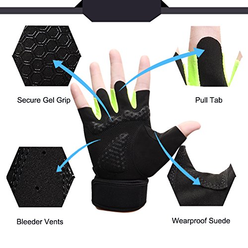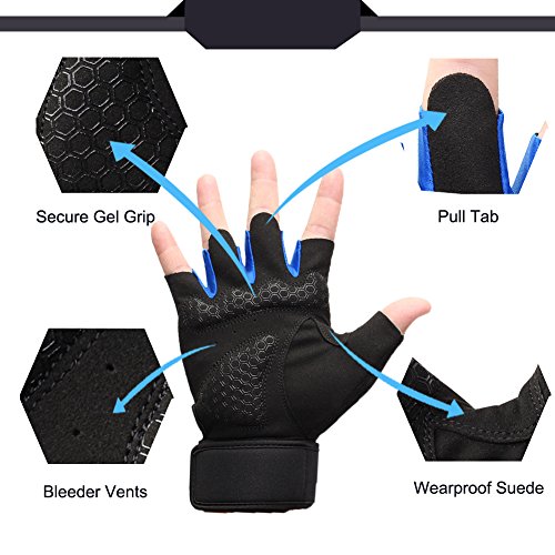 -. Feature : No more blisters,callus hands or peeling skin! Far away from hot and sweaty when you are lifting weights & biking riding. / Neat Double Stiching,Quality Comfortable Lycraspandex fabric. / The cushioned palm of gloves offer an easily grip-able fabric that is stitched over the suede in order to secure your grip, which is KEY to weightlifting. / The adjustable Velcro Wrist Wrap around your wrist,only feels secure. Pull tabs on the fingertip designed to make it easy take off easily. / Bleeder vents in palm super breathable.Towlling soft cloth on the thumb to wipe sweat quickly.