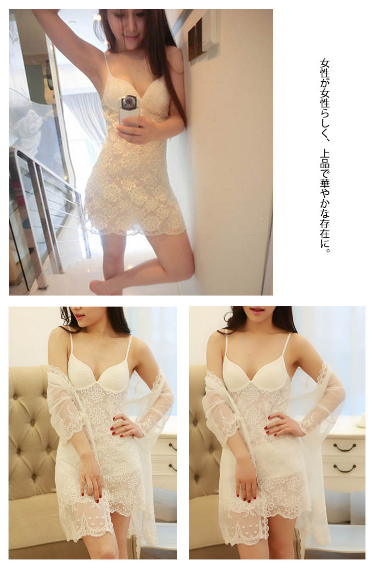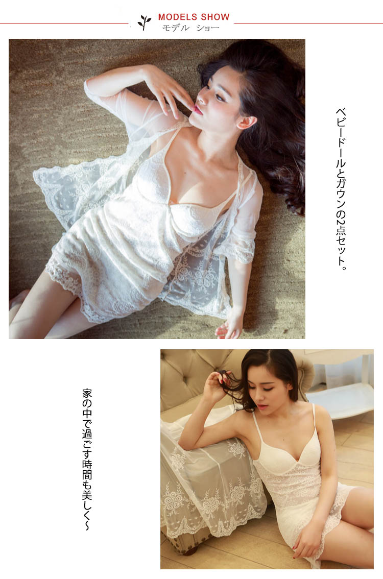 | ベビードールとガウンの2点セット。家の中で過ごす時間も美しく?女性が女性らしく、上品で華やかな存在に。上質な素材とエレガントなシルエットにこだわった贅沢なナイトウェアです。ココロもカラダも癒すように、くつろぎの時間も大切にしたい方におすすめ。 | |