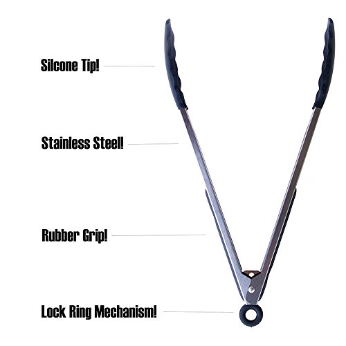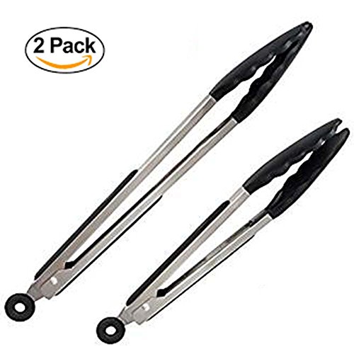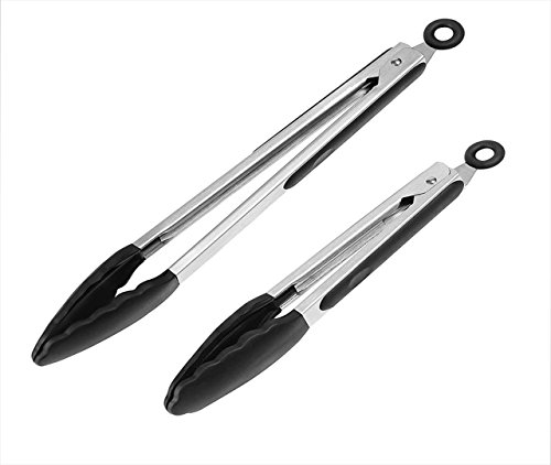 Product Description In need of some of the best quality tongs for your kitchen? Get yourself a pair of Chef's Life 12 and 9 inch quality tongs! Chef's Life Tongs comes in a set of 2 with one 12 inch and one 9 inch tong. It is made with silicone tips and is lined on the sides of with rubber for comfort and grip. Our tongs come with a locking mechanism for easy storage and a ring for hanging. 0
