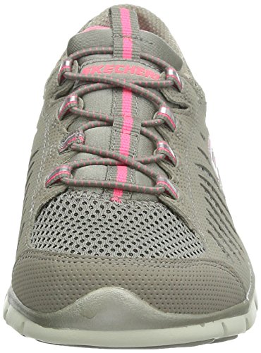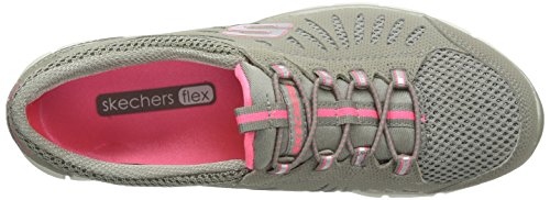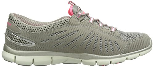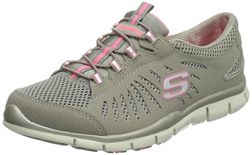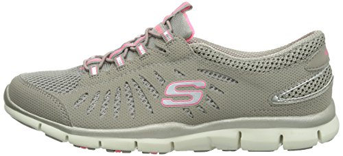 - Feature : Comfort and fun sparkling style comes in the SKECHERS Gratis - Faaabulous shoe. Smooth faux leather and mesh fabric upper in a bungee laced slip on sporty casual sneaker with glittering fabric detail, stitching and overlay accents. Flexible outsole. Smooth microperforated faux leather upper. Mesh fabric upper. Mesh fabric with glittering metallic fabric underlay. Bungee laced slip on sporty casual comfort sneaker. Stitching accents. Synthetic side overlay with oval cutout detail. Side S logo. Shiny patent synthetic edging trim on heel panel. Bungee laced front panel for easy slip on fit. Padded collar and tongue. Soft fabric shoe lining. Cushioned removable comfort insole. Shock absorbing flexible lightweight midsole. Contrast colored topsole border. Super flexible rubber traction outsole. 3/4 inch built in heel.