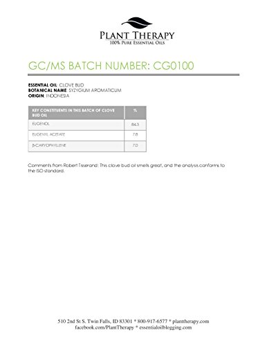 -. Binding : Health and Beauty -. Feature : Botanical Name: Syzygium aromaticum L / Aromatic Scent: Clove Bud Essential Oil smells spicy and rich like actual cloves. / 100% Certified Pure Therapeutic Grade Essential Oil- no fillers, additives, bases or carriers added. / Packaged in dark amber glass bottle with euro style dropper cap. / For your convenience all Plant Therapy Essential Oils have an oil identification sticker on the cap. This is especially beneficial if you use a top load carrying case. -. ProductGroup : Health and Beauty -. ProductTypeName : HEALTH_PERSONAL_CARE -. Title : Clove Bud Essential Oil 100% Pure, Undiluted, Therapeutic Grade