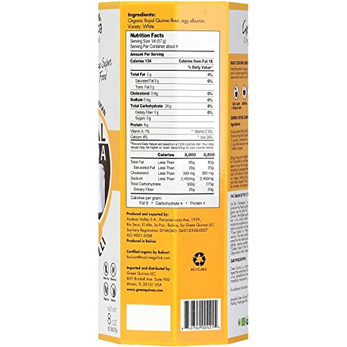 -. Binding : Misc. -. Brand : Green Quinoa -. Color : White -. EAN : 0850702004215 -. Feature : Our variety of white short Pasta is particularly a magnificent meal for all pasta and gluten- free lovers. It is made of 100% organic Quinoa Real. It can be ideally combined with any kind of sauce or salad / Made using white organic quinoa, pre-cooked flour and egg whites. Additives and preservatives free. It can be prepared in a matter of minutes. / The most demanding gourmet creations, as main dish at lunch and dinner or use it to create a variety of pasta salads / No corn, No Rice / 100% made with Quinoa Real -. IsAdultProduct : 0 -. Label : GREEN QUINOA -. Manufacturer : GREEN QUINOA -. NumberOfItems : 6 -. PackageQuantity : 30 -. ProductGroup : Grocery -. ProductTypeName : GROCERY -. Publisher : GREEN QUINOA -. Studio : GREEN QUINOA -. Title : White Fusilli 100% Quinoa Pasta (Pack of 6) -. UPC : 850702004215