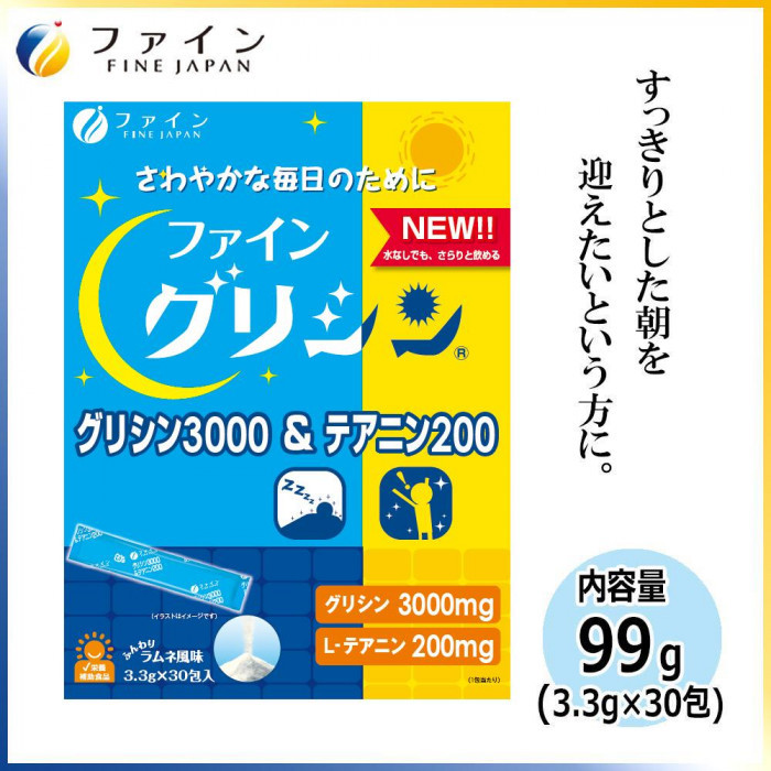 | 栄養成分 | 【1包(3.3g)あたり】 エネルギー:13kcal、たんぱく質:3.2g、脂質:0g、炭水化物:0.07g、食塩相当量:0g、グリシン:3000mg、L-テアニン:200mg |