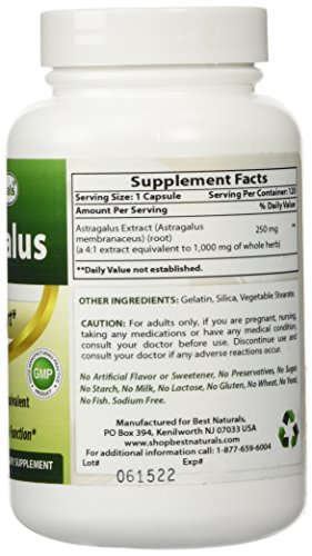 -. Binding : Health and Beauty -. Brand : Best Naturals -. EAN : 0817716012643 -. Feature : Immune System Support / Restore and maintain the body's natural state of balance. / Premium Herbal / Standardized extracts are guaranteed to contain a specific quantity of a known marker compound, and are laboratory tested to insure consistent potency. / All Best Naturals products are manufactured in accordance with Good Manufacturing Practices (GMP), among the highest standards in the world -- Proudly Made in USA -- Purity & Potency Guaranteed -. IsAdultProduct : 0 -. Label : Best Naturals -. Manufacturer : Best Naturals -. MPN : 817716012643 -. PackageQuantity : 1 -. PartNumber : 817716012643 -. ProductGroup : Health and Beauty -. ProductTypeName : HEALTH_PERSONAL_CARE -. Publisher : Best Naturals -. Studio : Best Naturals -. Title : Best Naturals Astragalus Extract 1000 Mg 120 Capsules -. UPC : 817716012643