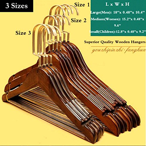 -. Feature : 1, PROFESSIONAL NON-SLIP DESIGNS: Our 100% Real Non-slip Solid Wood Suit Hangers with anti-skid teeth, perfectly combining with non-slip bar and precisely cut notches, effectively achieved the anti-slip effects / 3, DIMENSION: Three different sizes, the Small Size :(L x W x H) 12.75'' x 0.48'' x 9.3'', suitable for children's clothes; The Medium Size :(L x W x H) 15.1'' x 0.48'' x 9.5'', suits for women clothes; The Large Size :(L x W x H) 17.9'' x 0.48'' x 10.5'' ,suits for men clothes / 2, SPACE SAVING HANGERS: These wooden hangers flat body accommodates clothing of all shapes and styles ensuring them to be the best hangers for maximizing closet storage space and keeping your garments in original shape / 4, MULTIPURPOSE: Featuring anti-rust chrome 360 degrees swivel hook, the perfectly-cut notches along the hanger shoulder allow you to effortlessly hang shirts, blouses, and dresses. Sturdy construction can efficiently hang heavy winter coats, suits, sweaters and jackets & pants with ease / 5, PACKAGE: Total 15pcs of anti-skid wooden hangers were packed in a sturdy and elegant box .Please rest assured to purchasing and using them !