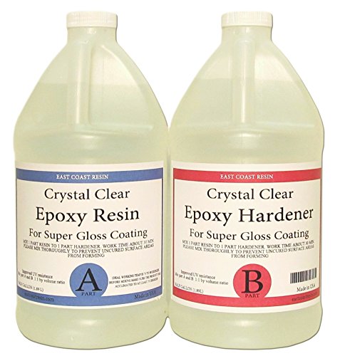CRYSTAL CLEAR EPOXY is a SUPER GLOSS , clear polymer that is used for coating wood, veneer, metal, stone, painted surfaces, table tops and many other surfaces to give a rich super gloss look and protect from scratching and air humidity. New improved UV resistance formula. 1 Gallon kit covers around 25 sq.f. (layer thickness 1.5-2 mm) Surfaces coated with this product are very durable, water resistant and easy to care for. Crystal Clear Epoxy contains two parts: resin 1/2 gallon and hardener 1/2 gallon, which are mixed together at a 1 to 1 ratio by volume. Work time is 30-35 min. Detailed instructions are included with each kit.