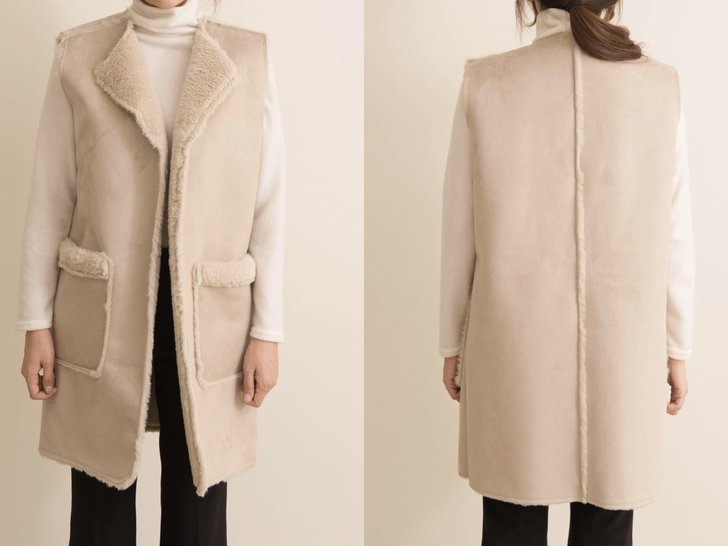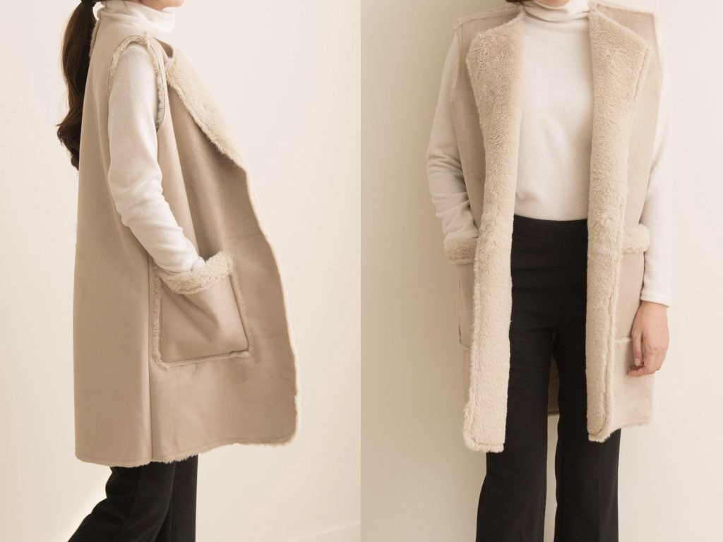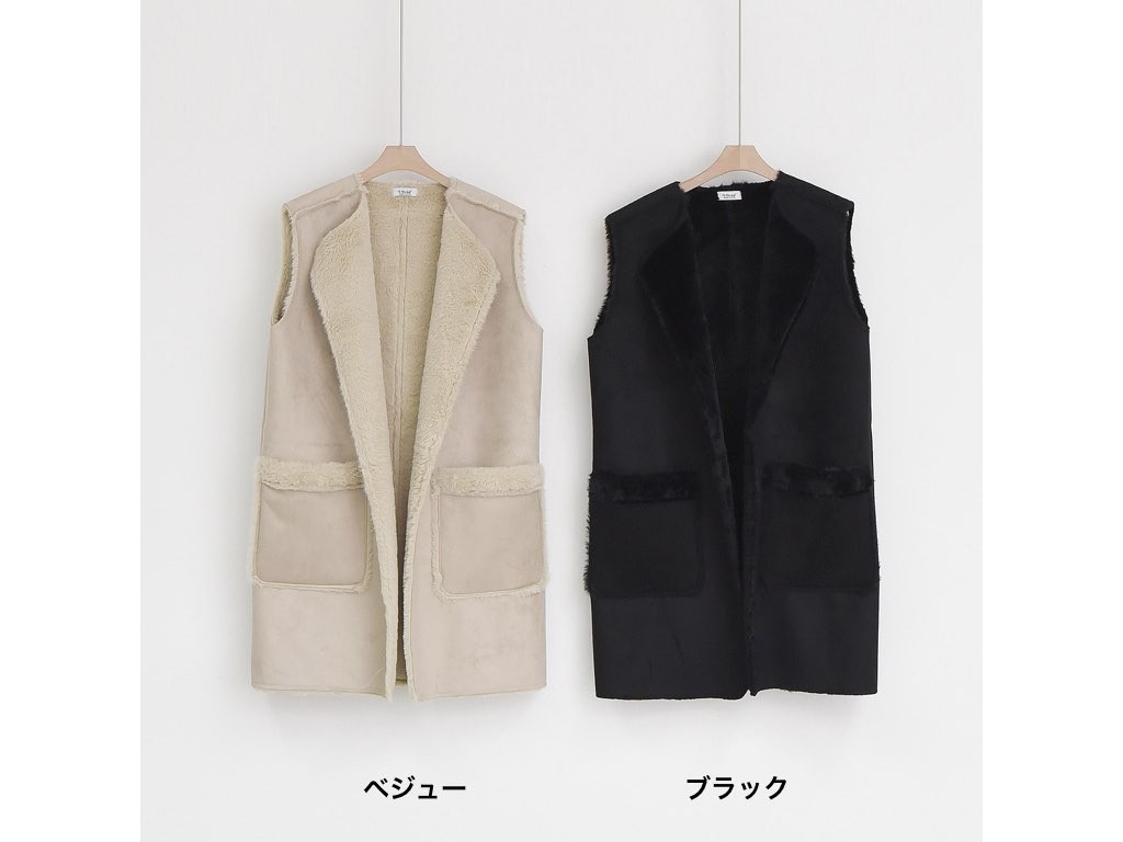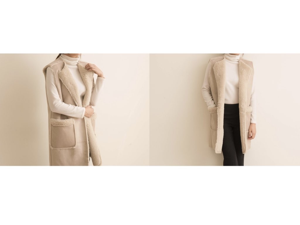 ロング丈のムートンベストです。トレンドのファーを取り入れた、フェイクムートンベスト。モコモコしていておりスタイリッシュに防寒対策ができます。裏地はボア素材となっており、とても暖かいです。1.基本情報色:2色展開(ベージュ/ブラック)サイズ:Free素材:ポリエステル製造国:korea2.サイズ情報肩幅:41cm 身幅(胸断面):55cm アームホール:22cm 着丈(前):86cm (サイズは計る方法に応じて±2〜3cmの誤差があります。ご了承お願い致します)モデル着用サイズ:F※着用モデル(163cm、体重47kg、足のサイズ24.5cm)3.その他の情報厚み:厚い透け感:なし伸縮性:なし裏地:なし洗濯方法:ドライ(クリーニング)[注意事項]お取り寄せ商品は、海外より仕入れるため納品まで約10日前後いただきます。また店舗でも販売しており、在庫切れになる場合もございます。ご了承お願い致します。