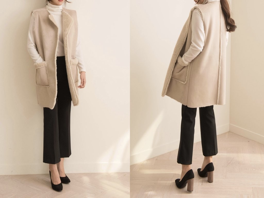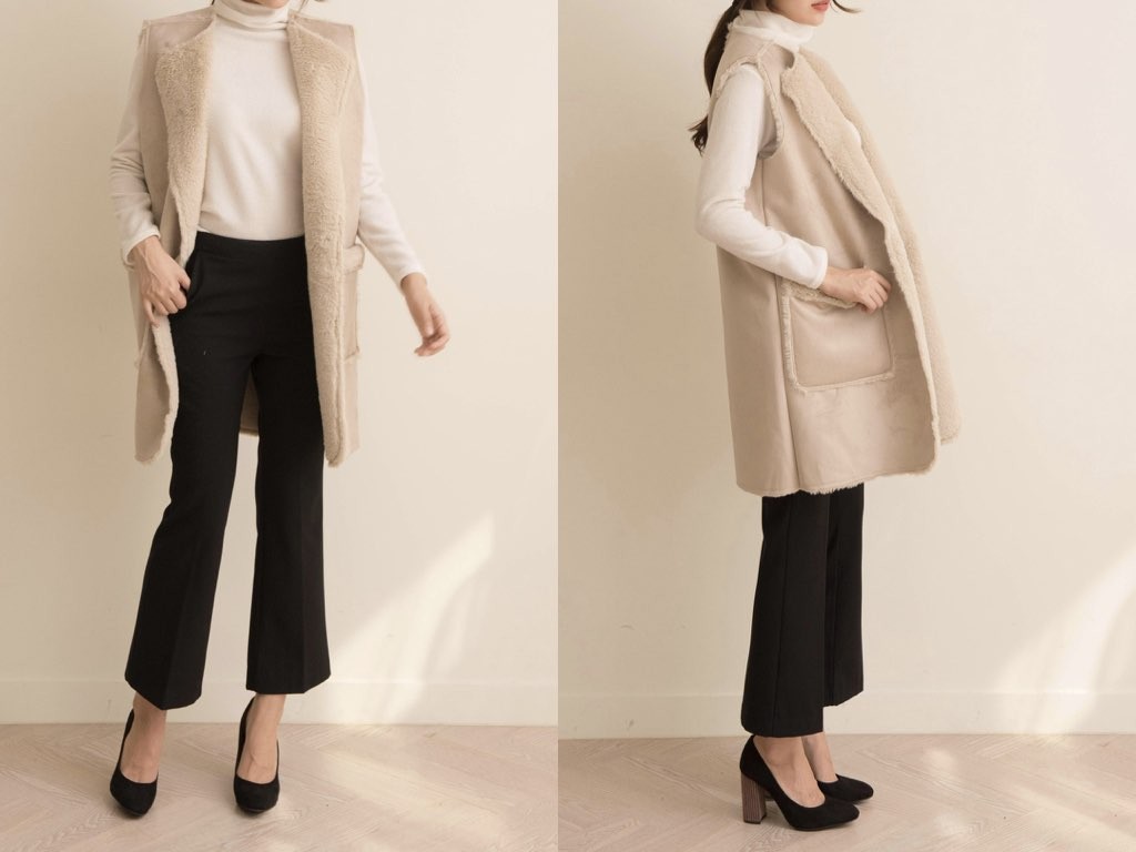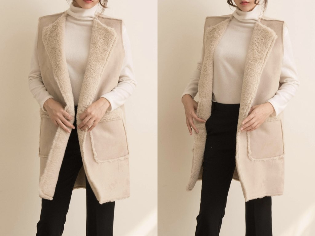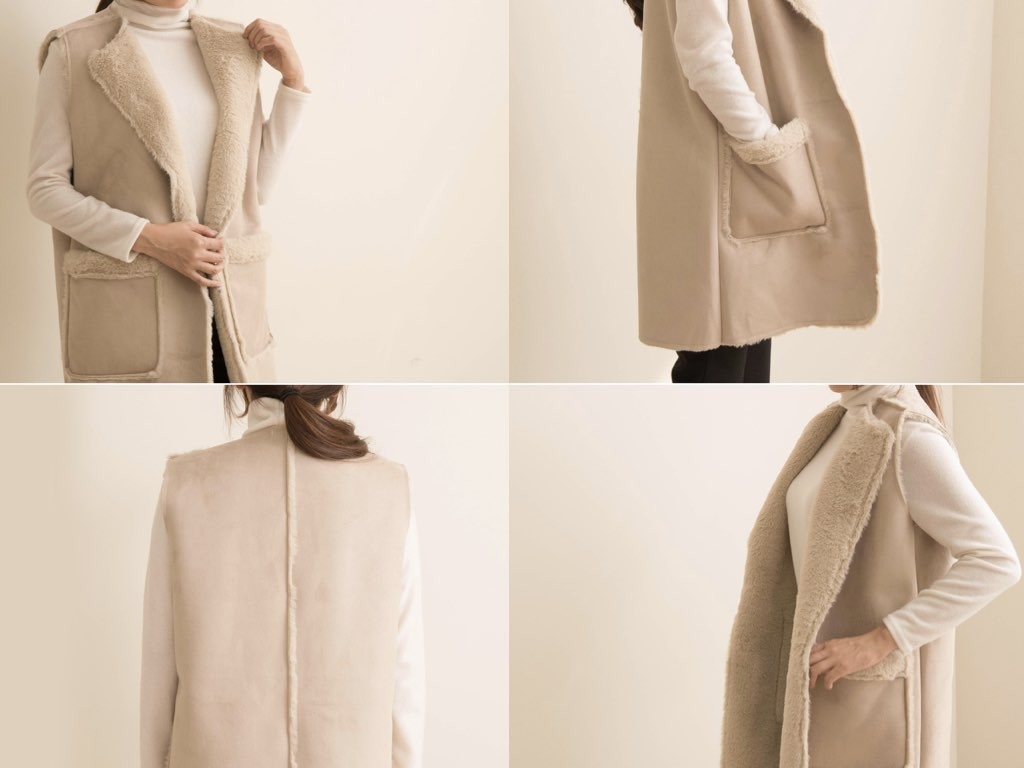 ロング丈のムートンベストです。トレンドのファーを取り入れた、フェイクムートンベスト。モコモコしていておりスタイリッシュに防寒対策ができます。裏地はボア素材となっており、とても暖かいです。1.基本情報色:2色展開(ベージュ/ブラック)サイズ:Free素材:ポリエステル製造国:korea2.サイズ情報肩幅:41cm 身幅(胸断面):55cm アームホール:22cm 着丈(前):86cm (サイズは計る方法に応じて±2〜3cmの誤差があります。ご了承お願い致します)モデル着用サイズ:F※着用モデル(163cm、体重47kg、足のサイズ24.5cm)3.その他の情報厚み:厚い透け感:なし伸縮性:なし裏地:なし洗濯方法:ドライ(クリーニング)[注意事項]お取り寄せ商品は、海外より仕入れるため納品まで約10日前後いただきます。また店舗でも販売しており、在庫切れになる場合もございます。ご了承お願い致します。