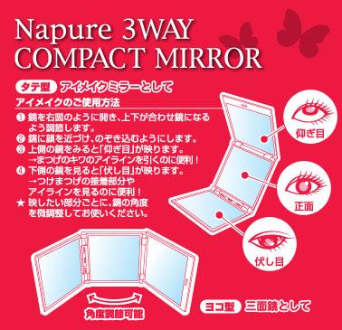 | タテ・ヨコどちらもOK!タテ型はアイメイクミラーとして、ヨコ型は三面鏡としてお使いいただけます。角度調節可能です!本当の色・自然な色を映す鏡「ナピュアミラー」を使用しています。 |