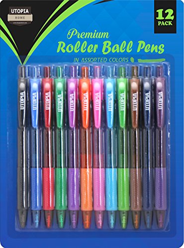 -. Title : Pack of 12 Premium Roller - Black Ink Ball Pens - Bold Fine Point - Retractable and Refillable - Assorted Colors Design - Black Ink - by Utopia Home