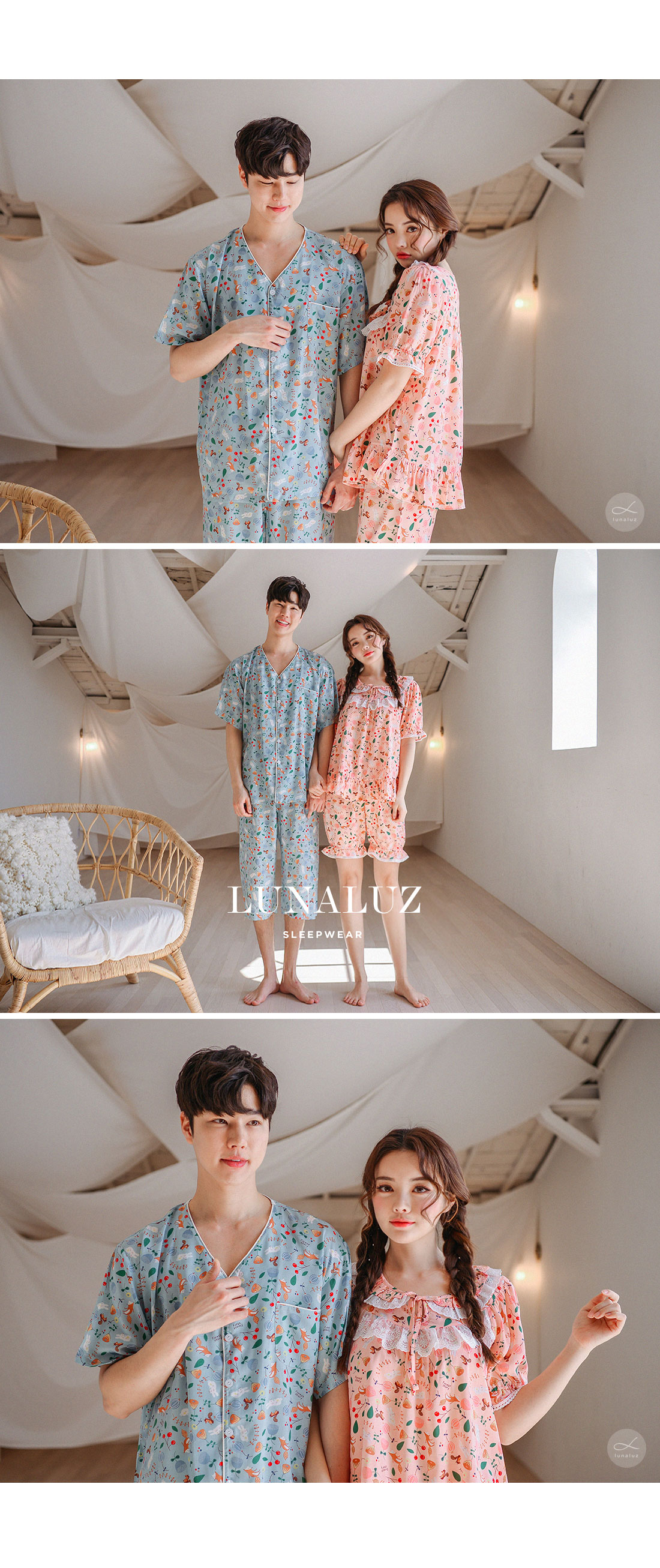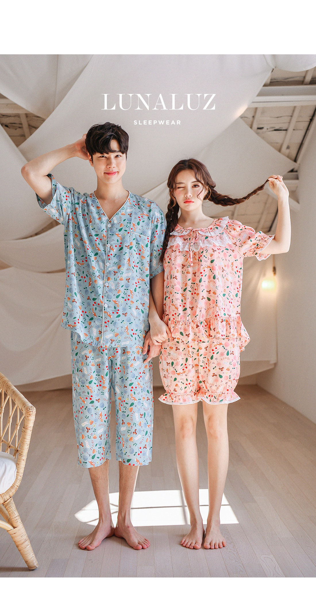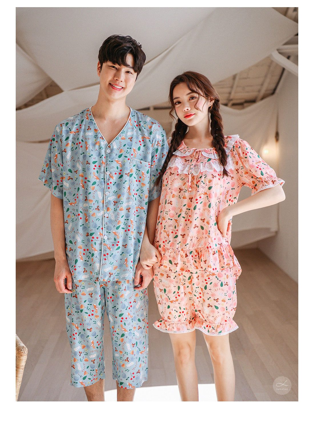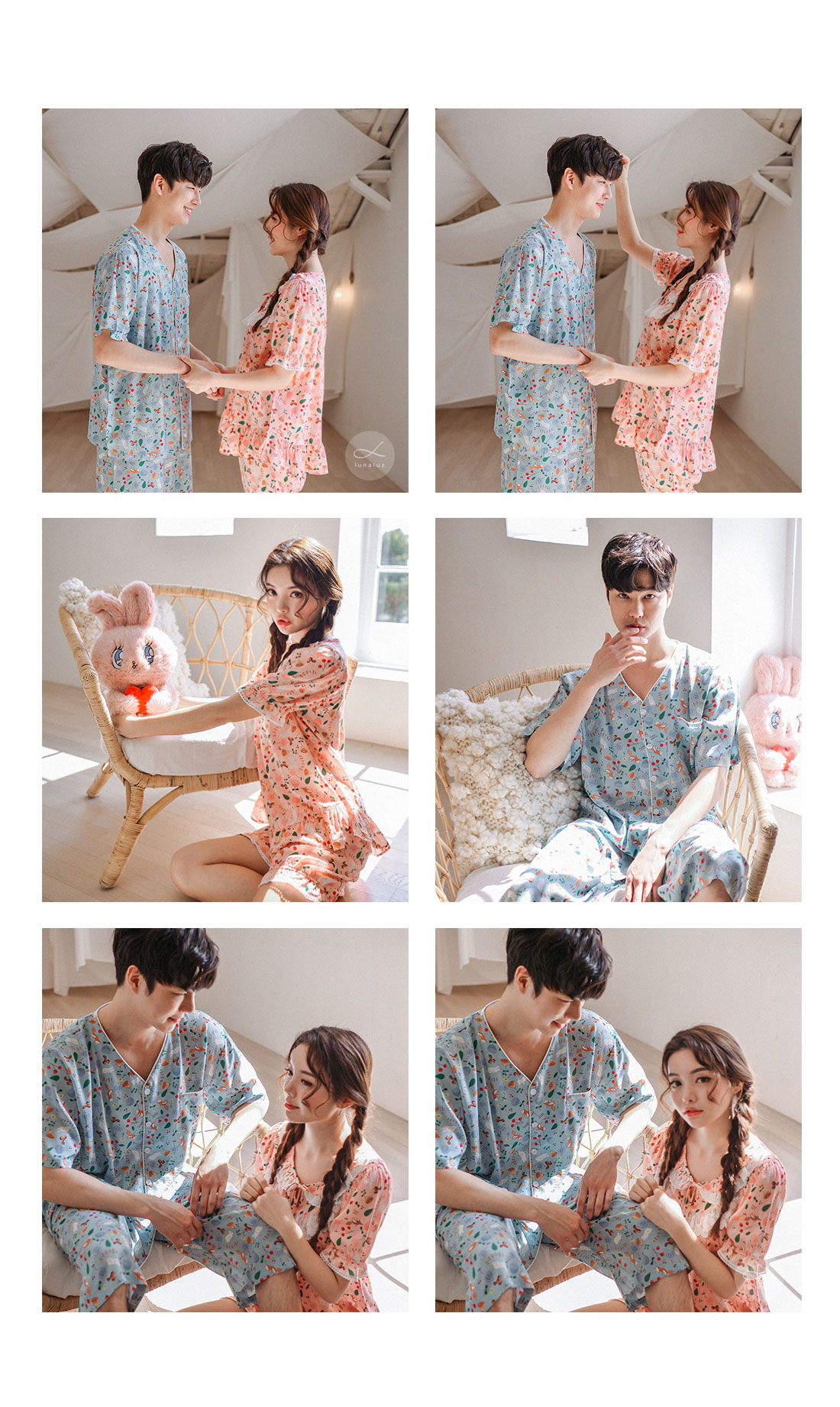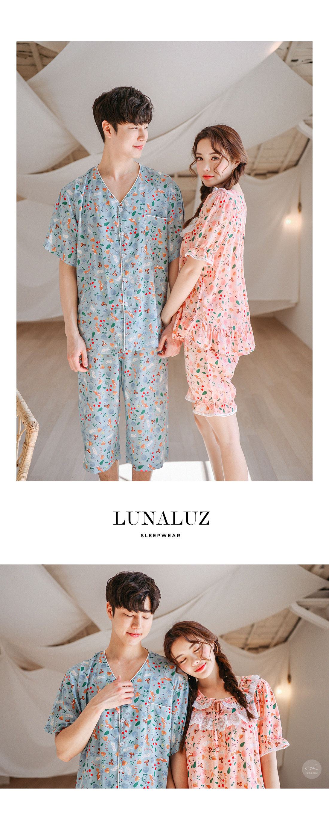 아기자기한 색감과 프린팅이 귀여운 커플느낌을 내어주는 레이온잠옷! 실키하고 드레이프성이 좋은 레이온 소재로 제작한 여름 잠옷이에요. 피부에 닿는 느낌이 시원해 더위를 많이 타는 고객님들에게 특히 추천해드리고 싶은 잠옷입니다. 시원한 색감 위에 동화에서 나올 거 같은 프린팅이 매력적인 원단이에요. 실루엣이 예뻐 보이는 소재의 특성상 체형의 결점을 슬림 하게 보완해줍니다. 얇고 흐늘거리는 소재인 만큼 까다롭고 고난위도의 봉제가 들어간 잠옷입니다. 부드럽고 체온유지와 통기성이 우수한 여름 잠옷으로 적극 추천해드립니다. 남성 잠옷은 시원한 색감의 스카이블루 , 여성 잠옷은 과즙미 나는 오렌지 컬러로 제작해보았습니다.