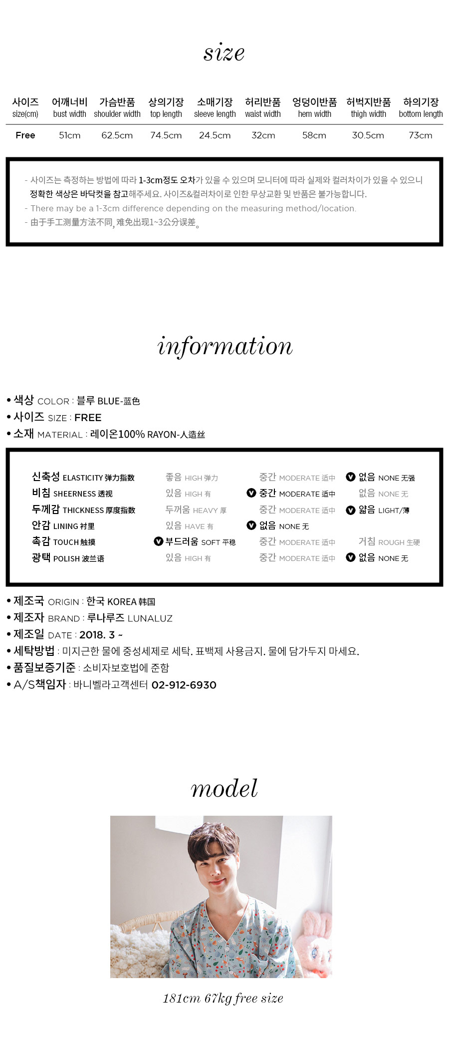 SIZE 남성 잠옷은 100size에게 적합한 free사이즈입니다. 여성 잠옷은 44반~66반size까지 커버 가능한 낙낙한 패턴의 free사이즈 입니다.