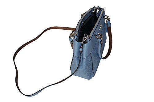 F28472 SILVER/POOL Signature smooth leather Inside multifunction pockets Snap closure, fabric lining Side zip compartments Handles with 6 1/4″ drop Detachable strap with 23 1/2″ drop for shoulder or crossbody wear 10 3/4″ (L) x 7 3/4″ (H) x 4″ (W)