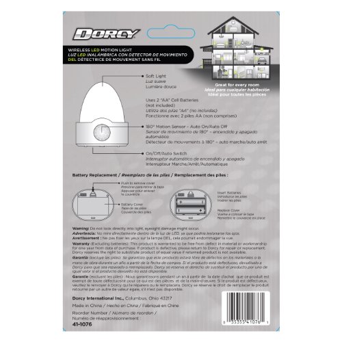 -. Binding : Tools & Home Improvement -. Brand : Dorcy International -. Color : White -. Department : unisex-adult -. EAN : 0730903842857 -. Feature : LED technology for a small area light anywhere you need it without connecting any wires / Motion sensor and photo sensor for activation only when it is dark or when motion is detected / Illuminates a 180-degree, 350-square foot area / Uses (2) AAs (not included) / Comes with a 1-year limited warranty -. Label : Dorcy International -. Manufacturer : Dorcy International -. Model : 41-1076 -. MPN : 41-1076 -. NumberOfItems : 1 -. PackageQuantity : 1 -. PartNumber : 41-1076 -. ProductGroup : Home Improvement -. ProductTypeName : HARDWARE -. Publisher : Dorcy International -. Size : AA -. Studio : Dorcy International -. Title : Dorcy International 41-1076 2-AA Battery Operated Indoor Motion Sensing LED Night Light, White -. UPC : 784497539419 -. Warranty : 1-Year Limited Manufacturer