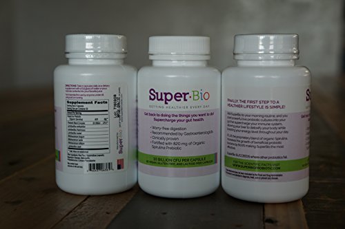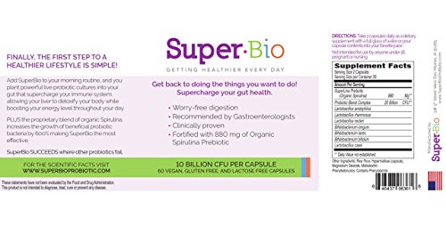 SuperBio is superior kind of probiotic supplement called a COBIOTIC, which supercharges gut health and provides essential daily nutrients. You got your first dose of probiotics from your mother when you were born. However, modern life and diet degrade your "good" gut bacteria, leaving you prone to infection, disease and depriving yourself of an important protective and supportive tool. Probiotics help you by improving gut health, they also help your immune system, liver function, cardiovascular health, mental health and reduce inflammation. They also give you important nutrients such as B vitamins, vitamin K, folate, and short-chain fatty acids. Up to 10% of our daily energy needs can be derived from the byproducts of the good bacteria in your gut. What makes SuperBio different? Although probiotics are good for you, just delivering probiotics to the gut is not enough. The gut is a densely populated community of trillions of bacteria, so adding a few billion probiotics to that mix will not allow them to compete or establish themselves. The probiotics need something else! They need fuel to supercharge growth. They need an effective PREBIOTIC. Prebiotic (Probiotic Fuel) is another name for the fiber that we are always told to eat, but we did not know exactly why we needed it. Probiotics use this fiber as a food source to help them grow. Many probiotic supplements use prebiotics, but unfortunately they only add a few milligrams per dose which is not enough to support the probiotic growth. At SuperBio we found an organic Spirulina, a blue green algae, that has a higher fiber content that Super-Charges probiotic growth. To ensure that SuperBio probiotics have enough food we add 400x more probiotic fuel compared to other supplements. In addition the Spirulina is also rich in essential daily nutrients like protein, fatty acids, vitamins, minerals and antioxidants.Feature