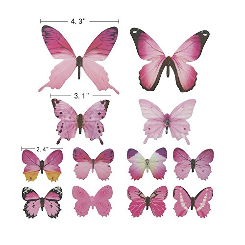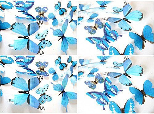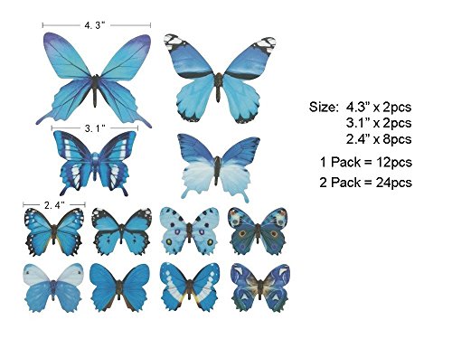 -. Feature : BUTTERFLY STICKER SET - 24 Pieces Artificial butterfly stickers with different sizes, bright color, looks likes real butterfly / EASY TO STICK - Apply to dry, clean and smooth surfaces; clean the place you want to stick the butterfly, just peel the paper on the butterfly, paste them, and make sure their wings lift up / GOOD DECORATION GADGETS - They can be applied to decor a theme party, butterfly museum embellishment, children room, garden parties, photography background, Christmas, wedding, birthday, etc / USE FOR A LONG TIME - Butterfly wall decals is made of PVC material, durable, anti-dust, convenient for you to clean which can make the butterfly last longer / 100% MONEY BACK GUARANTEE - When you order our 3D Butterfly Wall Decals today, you're protected by a 60 day, no-questions asked money back guarantee. TOTALLY RISK FREE, why not give it a try .
