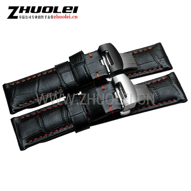 | [해외] 24 미리메터 수제 블랙 레드 스티치 정품 송아지 가죽 시계 스트랩 밴드 배포 버클 손목 스트랩 Panerai PAM |