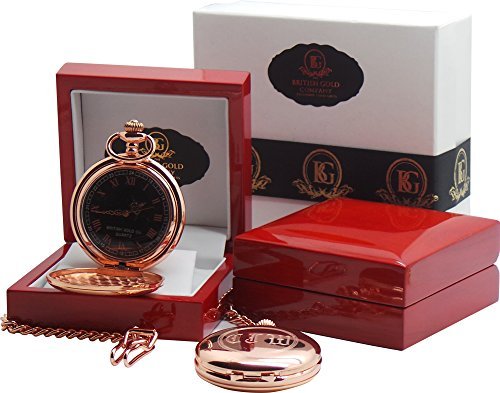 -. Binding : Watch -. Brand : The British Gold Company -. Department : Unisex-adult -. EAN : 5055618721682 -. Feature : 18ct Rose Gold Plated Full Hunter Pocket Watch / Housed in a Luxury Leather Lined Polished Walnut, Hinged Gift Box, Ribbon Wrapped / RELIABLE QUARTZ OPERATED - INCLUDES POCKET CHAIN / The finish is stunning. The dial is black with rose gold hands - A certificate is included / We will arrange for this watch to be engraved and shipped same day! -. Label : The british gold company -. Manufacturer : The british gold company -. Model : 5055618721682 -. MPN : BGC2OE -. PackageQuantity : 1 -. PartNumber : BGC2OE -. ProductGroup : Watch -. ProductTypeName : WATCH -. Publisher : The british gold company -. Studio : The british gold company -. Title : Free Engraving 18ct Rose Gold Pocket Watch Old English Monogram Initials to Full Hunter Case