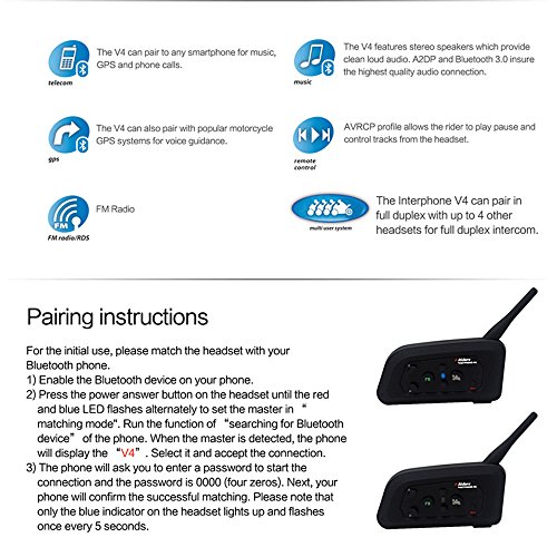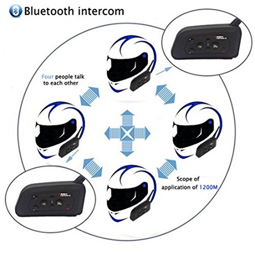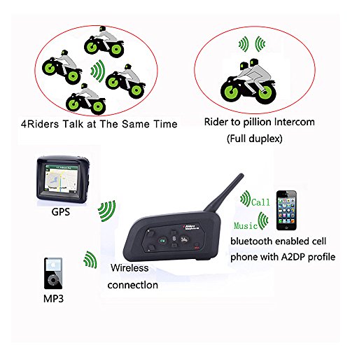 Studio : ESoku Publisher : ESoku Product Description 4 full-duplex intercom, matching the next boot can enter the intercom, do not need to press the PPT key, automatic real-time call! Features: 1. National Level 5 Waterproof Standard 2. The Bluetooth System That Allows The Max. Call Distance Between Two Riders Up To 1,200m and Actually Realizes The Fully Duplex Wireless Communication Among 4 Riders. 3. Strong Stereo Music/Audio Available (Mobile Phone/MP3/GPS with a2dp for Transmission) 4. DSP Noise Reduction Function 5. It Can Pair "Rider To Rider" Or "Rider To Pillion". Can Pair 4 Interphones At a Time, and Easily Switch To Any 2 of Them. Can Be Used As a Bluetooth Headset and a Wireless Music Headset While You're Not Riding Function: 1. FM Radio 2. Super Shock Stereo Headphones 3. Connected with The Mobile Phone with a2dp Stereo Function, MP3 Or 4. GPS Audio Navigator So As To Listen To Music 5. Automatic and Safe Receiving of Mobile Phone Calls Specification: Inbuilt Polymer Lithium Battery with Capacity Up To 500ma Standby Time: About 150h Continuous Call Or Music Playing Above 8h Charging Time About 2.5h with 3.5mm Audio Input, Can Work with External Media Play Devices, Like MP3/Portable CD Player/Ipod and Etc. Package: 2 x 4 Riders Intercom 2 x Headsets 2 x USB cable 2 x Fixed clamp 4 x Screws 1 x Screwdriver 1 x User Manual