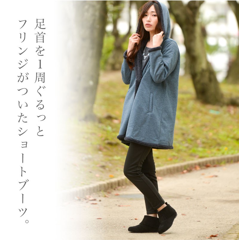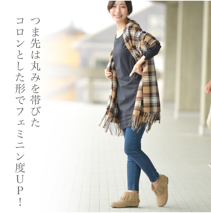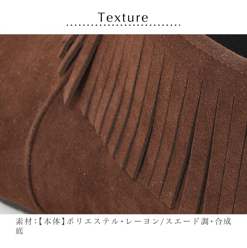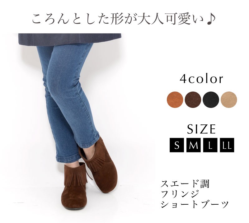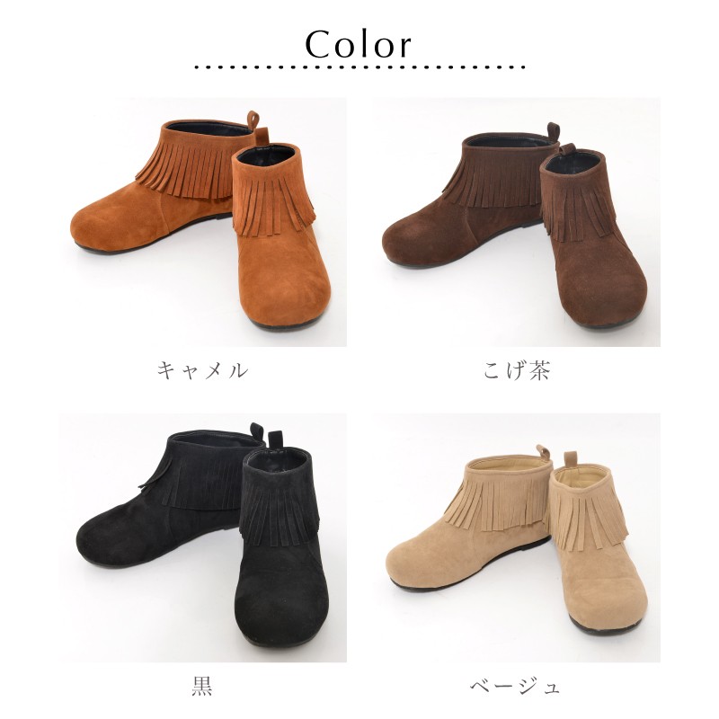 スエード調フリンジショートブーツ。 足首を1周ぐるっとフリンジがついたショートブーツ。 スエード調のマットな質感で、肌をきれいに見せてくれます。