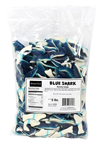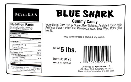 -. Binding : Misc. -. Brand : Kervan -. EAN : 0640746483271 -. Feature : Blue Shark Gummy Candy, 5 Lbs / The mouthwatering gummy sharks are great for kids of all ages / 5 Pound bag of your favorite mouthwatering candy delivered to your door / Perfect for themed parties or events, use as decorations or as party favors / Made in Turkey - HALAL CERTIFIED CANDY. -. IsAdultProduct : 0 -. Label : Kervan -. Manufacturer : Kervan -. PackageQuantity : 1 -. ProductGroup : Grocery -. ProductTypeName : GROCERY -. Publisher : Kervan -. Size : 80 Ounces -. Studio : Kervan -. Title : Blue Shark Gummy Candy, 5 Lbs -. UPC : 640746483271