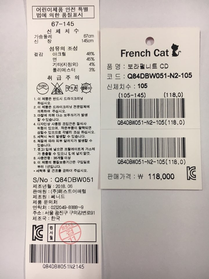 제품소재 : 겉감 아크릴48% 면45% 기타(지정)4% 폴리에스터3%