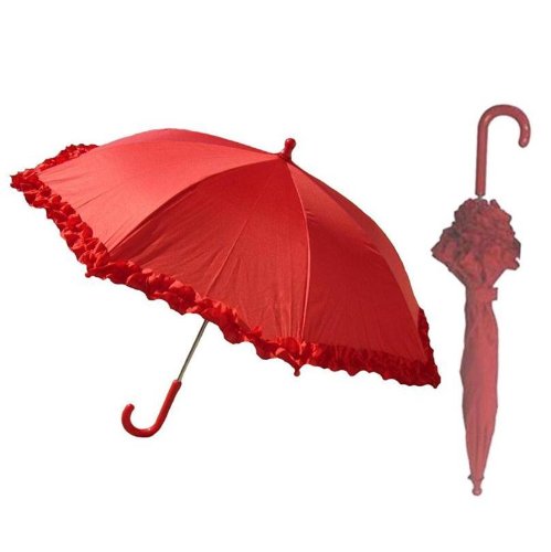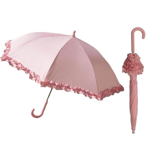 -. Feature : Kids Parasol stick umbrella for girls stands 24 inches tall / Parasol canopy has ruffled edges / Polyester canopy opens to a 34 inch arc / Manual easy-slide pinch-proof open / close mechanism