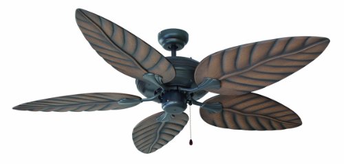 The Design House 154104 Martinique 52-Inch 5-Blade Ceiling Fan features a tropical design and an oil rubbed bronze finish. Perfect for any indoor or outdoor space. Use the pull chain to control your 3-speed motor and toggle between three different speed settings. The (5) leaf-shaped fan blades have a chestnut finish. Downrod only mount, great for high ceilings. Run the motor in reverse to help conserve energy costs during all seasons. Blades can be run on the normal setting during the summer to create cooling air flow and on reverse in the winter to re-circulate warm air from the ceiling. This fan is UL listed, rated for 120-volts and is approved for damp areas. Motor is light kit adaptable. Measuring 52-inches, this fixture adds a dramatic accent to any home or condominium. The Design House 154104 Martinique 52-Inch 5-Blade Ceiling Fan comes with a 10-year limited warranty that protects against defects in materials and workmanship. Airflow efficiency: 94 CFMW. Watts: 55. Airflow at high speed: 5150 CFM. Blades have a 10-degree pitch. Design House offers products in multiple home decor categories including lighting, ceiling fans, hardware and plumbing products. With years of hands-on experience, Design House understands every aspect of the home decor industry, and devotes itself to providing quality products across the home decor spectrum. Providing value to their customers, Design House uses industry leading merchandising solutions and innovative programs. Design House is committed to providing high quality products for your home improvement projects.Feature