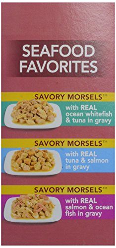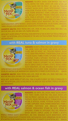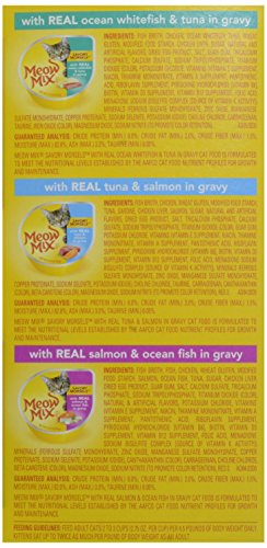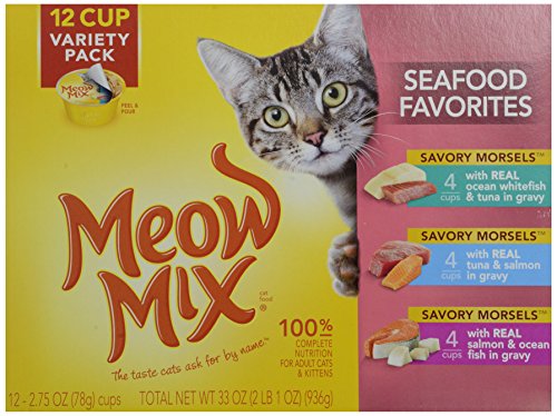 Meow Mix Seafood Favorites Variety Pack Cat Food - 12 CT..Meow Mix Seafood Favorites Variety Pack Cat Food..New look!.Same great taste!.It'-s All About The Mix..100% complete nutrition for adult cats & kittens..12 cup variety pack..Savory Morsels, 4 cups with Real Ocean Whitefish & Tuna in Gravy..Savory Morsels, 4 cups with Real Tuna & Salmon in Gravy..Savory Morsels, 4 cups with Real Salmon & Ocean Fish in Gravy..Meow Mix Savory Morsels seafood favorites variety pack has the perfect mix of tastes your cat will love..Made with pieces of real tuna, ocean fish or salmon to make every mealtime irresistibly delicious..Savory Morsels..With real ocean whitefish & tuna in gravy..A medley of flaky ocean whitefish & tuna, served in gravy..With real tuna & salmon in gravy..A delicious mix of tuna & salmon, served in gravy..With real salmon & ocean fish in gravy..Morsels of salmon & ocean fish, served in gravy..Guaranteed analysis: Crude protein (min.).8.0%- crude fat (min.).2.0%- crude fiber (max.).1.5%- moisture (max.).82.0%- ash (max.).3.0%- taurine (min.).0.05%..Meow Mix Savory Morsels with real ocean whitefish & tuna in gravy cat food is formulated to meet the nutritional levels established by the AAFCO cat food nutrient profiles for growth and maintenance..82%- ash (max.).Meow Mix Savory Morsels with real tuna & salmon in gravy cat food is formulated to meet the nutritional levels established by the AAFCO cat food nutrient profiles for growth and maintenance..Meow Mix Savory Morsels with real salmon & ocean fish in gravy cat food is formulated to meet the nutritional levels established by the AAFCO cat food nutrient profiles for growth and maintenance..All rights reserved..Questions or comments: visit our website at www.meowmix.com or call 1-877-MEOW MIX (1-877-636-9649) weekdays with the in