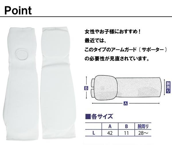 腕全体をがっちりガードするタイプで、攻防による打撃を軽減。最近ではこのタイプのアームガード(サポーター)の必要性が見直されています。