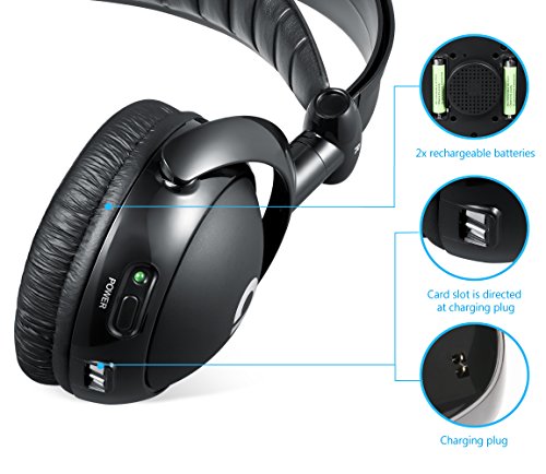-. Feature : Reproduces authentic sound better with 15-22,000 Hz frequency range and 40mm driver unit; triple frequency equilibrium with resonant, intermediate and deep sound / 2.4G wireless transmission and interference-free reception through walls, with range up to 30m; shorter delay and minimal distortion / Supra-aural headset with adjustable soft-padded headband designed for maximum comfort; large over-ear headphones entirely enclose your ears, offer immersive listening experience with passive noise canceling; listen to music for hours and forget you are even wearing them / 3.5mm audio connector and adapter for transforming 3.5mm audio connector into 6.3mm audio connector are supplied and make these over-ear headphones compatible with hi-fi audio amplifiers, CD players, computers, cellphones, MP3s, Blu-ray players, radios, tablet PCs, etc. / Wireless transmitter is also the headphones' charging dock, two rechargeable batteries are also supplied; install batteries before use and direct headphones card slot at charging plug in the charging dock when charging; 6 hour charge time provides 12 hours use