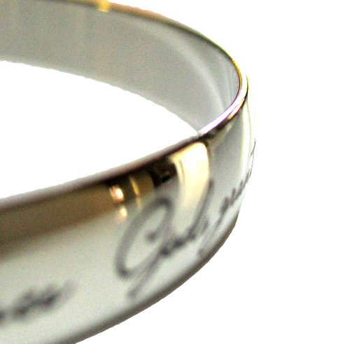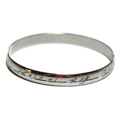 Beautiful bangle has the solid, polished feel that you expect from finer jewelry. The Serenity Prayer clearly engraved in delicate frosted script all around the circumference of the bangle. Classic, softly rounded shape was designed for its timeless elegance and versatility. This is NOT a broadcast of the prayer so expect it to be discreet.Feature