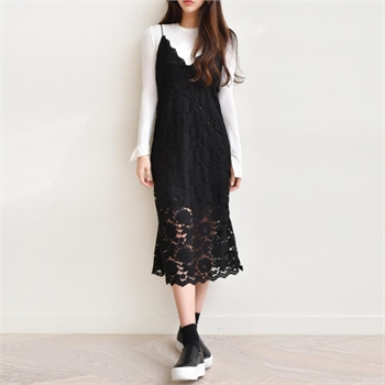 전체적으로 시스루한 레이스 디테일로 고급스러움이 묻어나는 원피스에요. 과하지 않게 여성스럽고 로맨틱한 느낌을 표현하고 싶을 때 제격!
