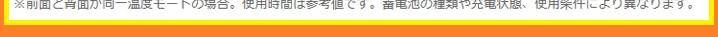 ●3モード切替で発熱箇所や温度モードを自由に組合わせ!温度切替スイッチ(前面、背面)を、それぞれ長押し(約2秒)すると、「急暖」モード※で暖房をはじめます。前面、背面、それぞれで温度モード切替が可能です。※電源投入後、自動的に急暖モードになります。「急暖」モードの状態で、温度モードの切替え操作がなければ、自動的に(約5分後)「中」モードに切替わります。
