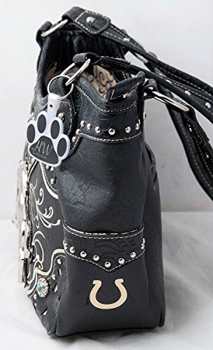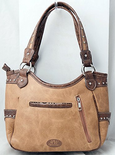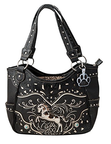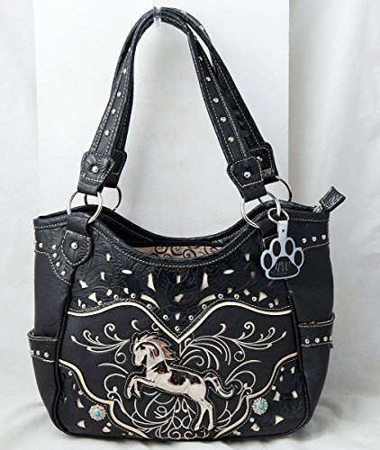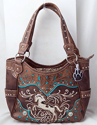 Product Description Western handbag is made from high quality premium faux/imitation PU leather with silvertone studs, blue conchos, colorful embroidered designs, laser cut tooled pattern on top and on trim, decorated with silvertone horse, and detachable HW Collection key ring/purse charm on the front. Secure your possessions with its zip top closure. Spacious with its single compartment fabric lined interior, front wall that has 2 open pouch pockets and a zippered wall pocket on inside rear. One secure zippered pocket on the back for a concealed carry handgun (9 inches long x 5 inches tall) and one open pocket that can fit 5 inch phone. Double flat strap handles. Two side open pockets with horse shoes that can store your tissues, lipstick or any items you need to access quickly and easily. Metal feet on the bottom to keep the bag clean, protected and stable. Suitable for work, shopping, vacations, evenings out with friends or just to stand out and show off your equestrian flair. Top handle bag is 14 inches long X 10.5 inches tall x 5 inches wide. 0