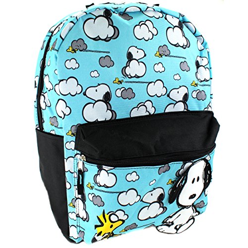 -. Feature : Backpack measures approximately 17" X 14" X 4.5" / Zipper closure; Adjustable, padded shoulder straps; One mesh side pocket; One solid side pocket / Front zip-up pocket; Webbed hanging locker loop / Embroidered applique with 3D movable ears and feet / Features Snoopy and Woodstock from The Peanuts