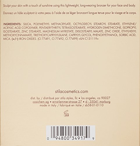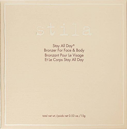-. Binding : Health and Beauty -. Brand : stila -. Color : Light -. EAN : 0094800349179 -. Feature : The perfect complement to all skin tones, Stay All Day Bronzer is a lightweight, matte-satin powder that is ideal for accenting the face and body to perfection / Features are sculpted and shaped with long-wearing pigments that blend effortlessly for a natural-looking result. -. Label : stila -. Manufacturer : stila -. Model : SB58010001 -. MPN : SB58010001 -. PackageQuantity : 1 -. PartNumber : SB58010001 -. ProductGroup : Prestige Beauty -. ProductTypeName : LUXURY_BEAUTY -. Publisher : stila -. Studio : stila -. Title : stila Stay All Day Bronzer for Face and Body, Light, 0.53 oz. -. UPC : 094800349179