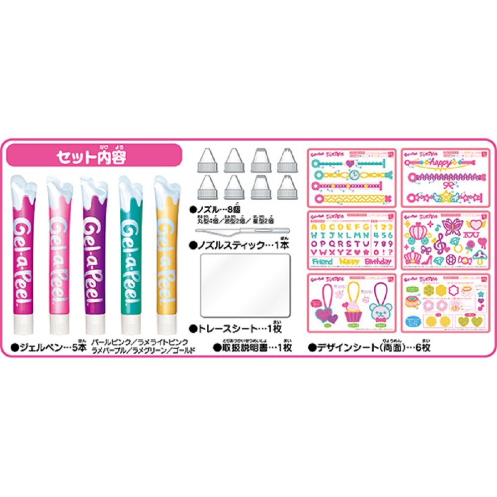 [Set contents] 5 pieces of gel pens (Pink Lame, Gold, Lame Purple, Light Pink Lame, Purple Pearl), 1 trace sheet, 6 design sheets (both sides), 8 nozzles