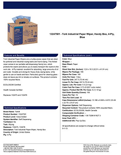 -. Title : Tork 13247501 Industrial Paper Wiper, Handy Box, 4-Ply, 12.8" Width x 16.5" Length, Blue (Case of 1 Box, 180 Towels)