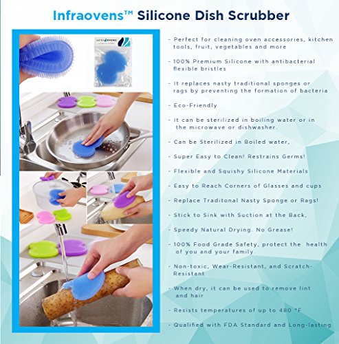 Set of 4 flexible cutting mats in assorted bright colors and food icons for use with different types of food to prevent cross-contamination - Infraovens™ Blue Silicone Dish Scrubber