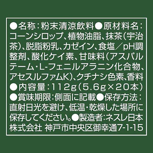 原材料:コーンシロップ、植物油脂、抹茶(宇治茶)、脱脂粉乳、カゼイン、食塩/pH調整剤、酸化ケイ素、甘味料(アスパルテーム・L-フェニルアラニン化合物、アセスルファムK)、クチナシ色素、香料