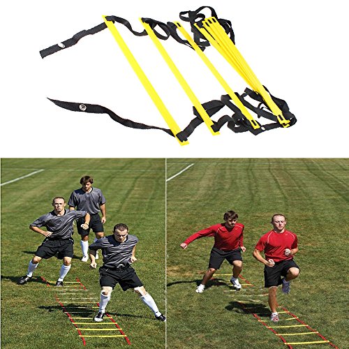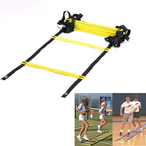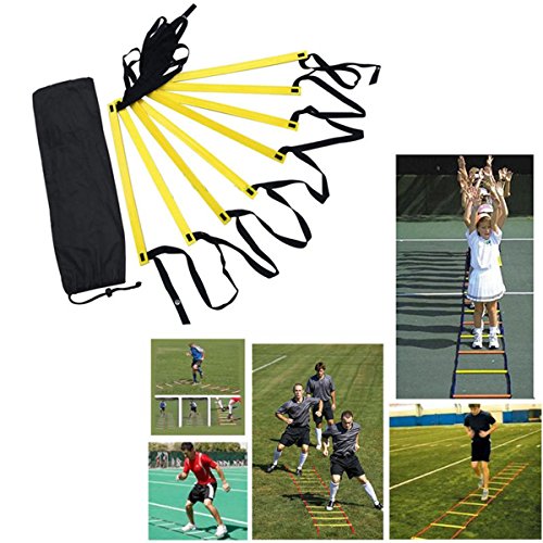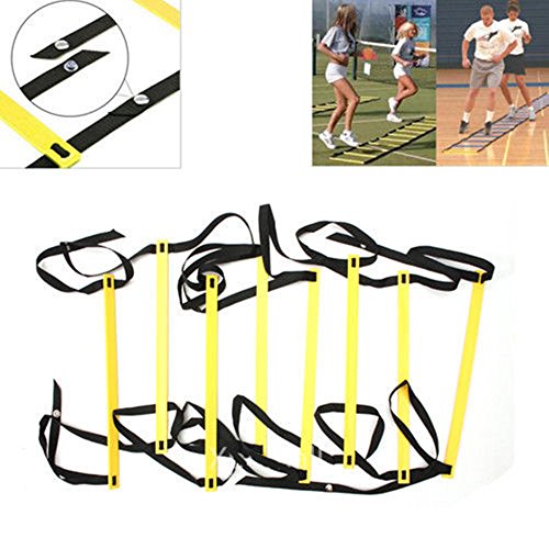 -. Feature : New generic 4-meter Agility Training Ladder, Yellow / 8-Rung heavy duty design and made of durable nylon straps / 15.7-inch from rung to rung / Adjustable flat plastic rungs for safety / Ideal tool for all athletes and trainers to improve foot speed, movement control, lateral response, coordination, overall balance and general fitness