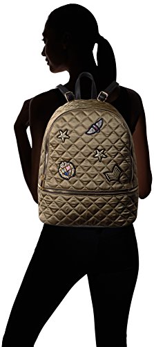 Back pack in quilting with military patches and zipper feature on front