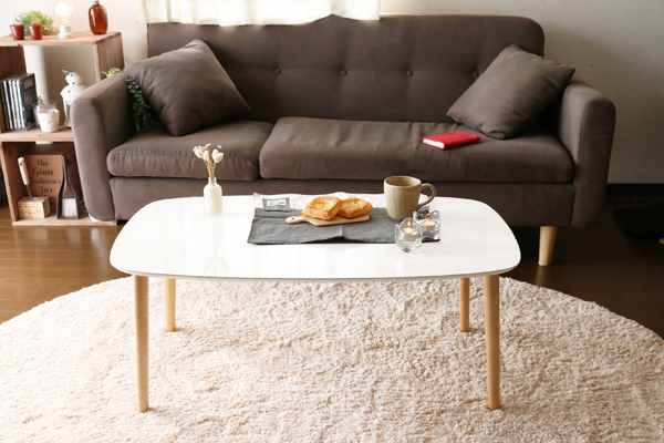 ●木目調の鏡面仕上げが美しいテーブル。ちょっとした軽食時や書き物におすすめ。