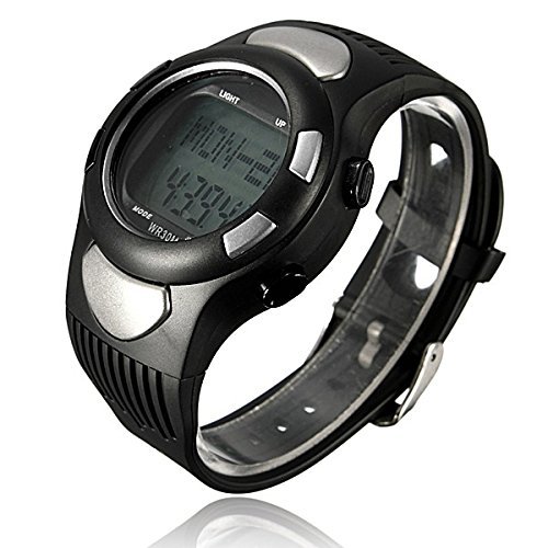 -. Feature : This watch calculate your heart rate and calories burned while exercising, without chest strap. Besides, this watch with pedometer function. Features: Time frame: January 1, 2000 - December 31, 2099. 12/24 hour clock selection. Week is automatically displayed. / 3 group alarm function. Alarm Time: 1 minute. Pedometer Function: 7 seconds intelligent design step as below : Three kinds of pedometer models show: total steps , time display mode - pedometer / exercise time display mode - calories ,mileage display modeer information setting: Metric , Imperial - weight - step - G-Sensor sensitivity. / Heart rate measurements: Heart rate measuring range: 30 to 200; Through contact measurement, display the dynamic pulse of the times. / Can bind options: Whether the heart rate measurement mode. Backlight: EL or LED IC operating voltage: 3V / Package Includes: 1 X Spots Fitness Watch 1 X English User Manual