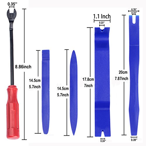 - 5pcs Panel Trim Removal Tool Kits perfect for installing and removing audio equipment, door and window trim, moldings, panels, dashboard and clips. They can prevent scratching and damage to vehicle paint leather chrome etc.