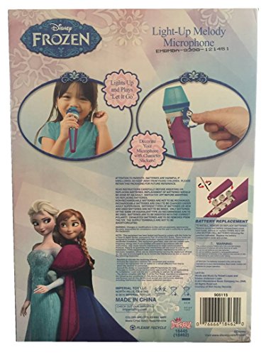 Disney "Frozen" Sparkling Light-Up Melody Microphone Plays "Let It Go" The microphone lights up with different color light and plays a short clip of the song "Let It Go" from the hit movie Frozen. The set comes with microphone, (already installed) 3 button cell batteries and several Frozen character stickers to help decorate your microphone. Microphone measures approximately 7" long.Feature