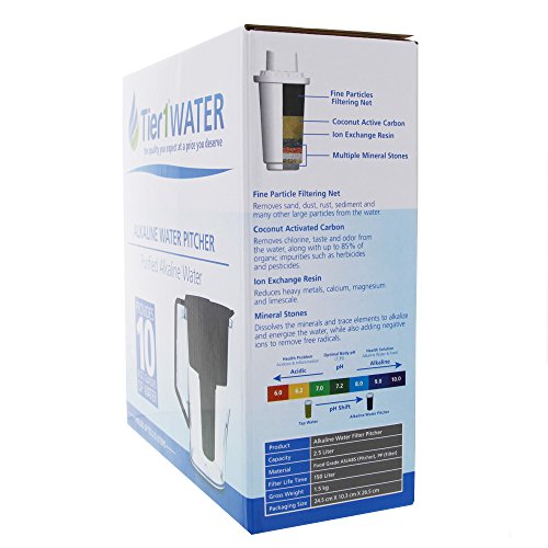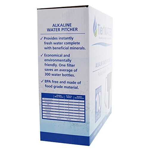 The Alkaline Water Pitcher by Tier1 provides multi-stage filtration that dissolves the minerals and elements in your water to alkalize and energize your drinking water. Alkaline water has low acidity, high pH balance, and adds negative ions to remove free radicals. This level of purification allows for high quality, great tasting drinking water. This pitcher is recyclable and environmentally friendly, made with food grade and BPA-free materials. With a space-saving design, at only 4 inches wide, this pitcher perfectly slides into place on your refrigerator's top shelf. Don't hesitate, order today!Feature