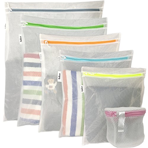 Size:6 set 2*Medium 16*12 Inch For T-shirt, socks, underwear. lingerie, scarf, etc. 2*large 20*16 Inch For blouse, sweater, coat, pants or two T-shirts,Thermal underwear, etc. 1*Jumbo 24*20 Inch For down jacket, cotton wadded jacket, sheet, window screening, etc 1*Plus 7*7 Inch For Bra Wash •Protect your delicates If you've tried any ordinary laundry wash bags, you'll notice the Inside Smarts difference in no time. Go&so Wash Bags are made of premium-grade mesh that makes them as strong & durable as they are luxurious & smooth. ? •Keep everything in its Place. Keep like-colors separated using the 4 white wash bags for light-colored loads, and the 1 large bag for dark-colored items. The Bra Wash Bag is a plus size version. It can accommodate three bras.? •Make every Wash Quiet & Safe. Zippered mesh laundry bags can be noisy, but not this new, slip the rustproof zipper under the smart zipper guard to protect & ensure a quiet, snag-free wash. Protect your expensive garments with confidence.