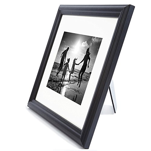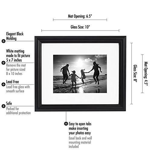 ELEGANT DESIGN: 8x10 photo frame with a unique decorative molding with easel stand. Display photos sized 5x7 inches with mat or 8x10 inches without mat. Comes with easy to install hanging hardware or display on desktop with the built in easel.